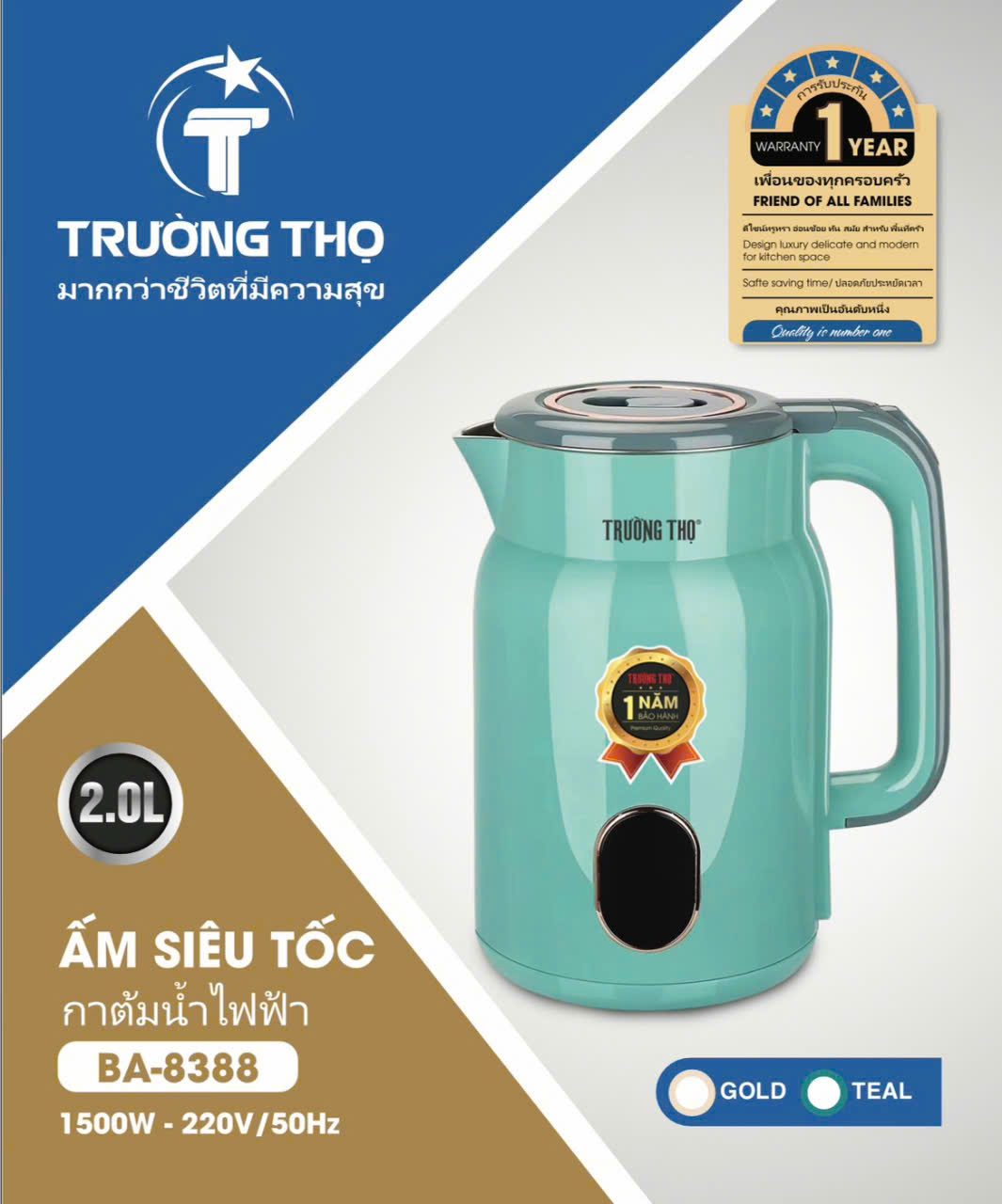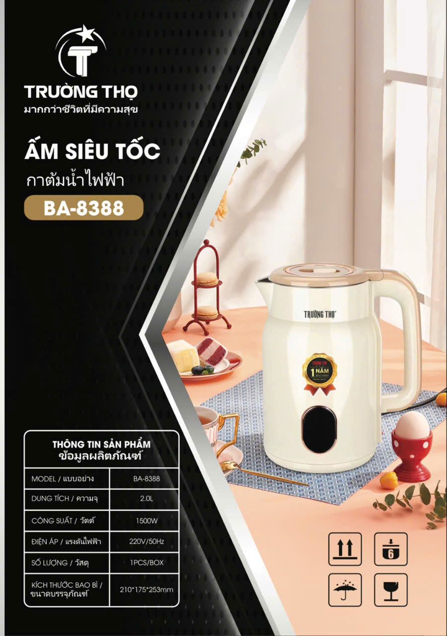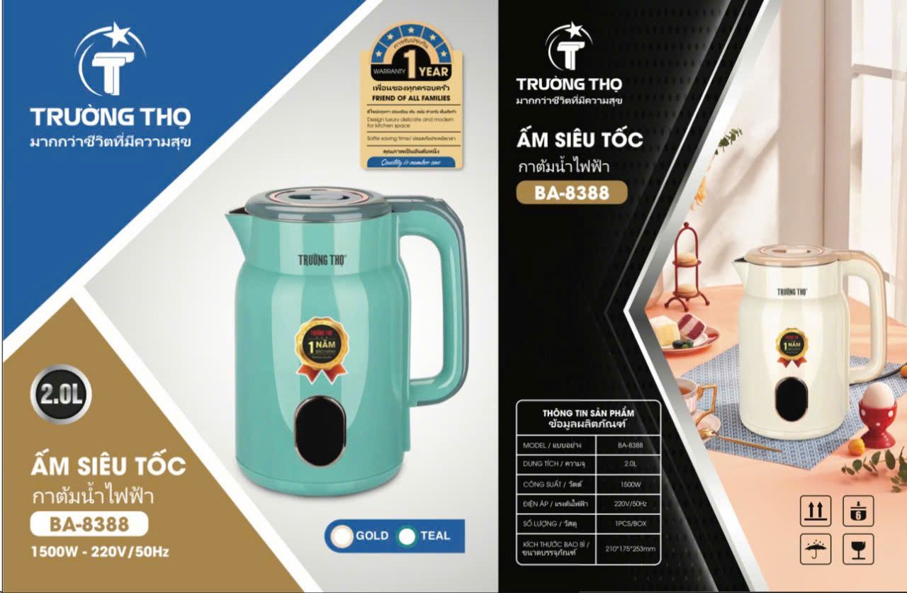 Đặt mua Ấm siêu tốc 2 lớp, lòng Inox đúc liền Trường Thọ BA8388
