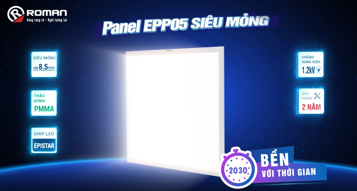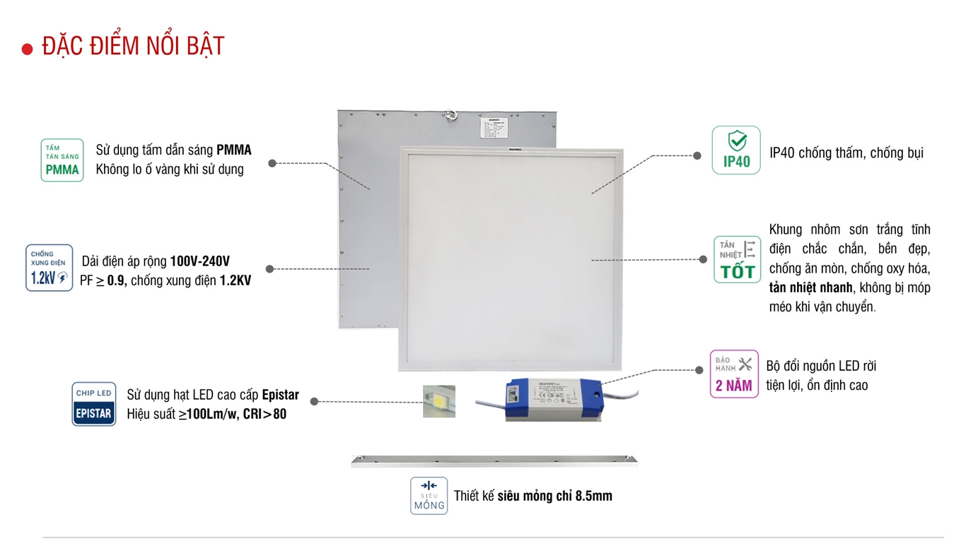 | Chất liệu | Khung nhôm sơn trắng, tấm dẫn sáng PMMA |