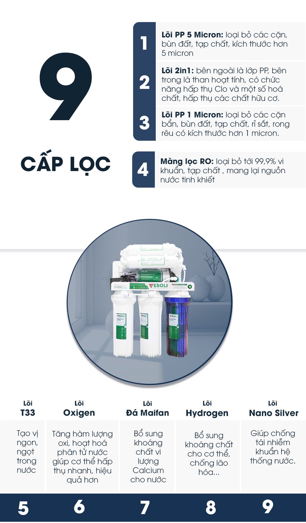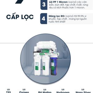 - Màng lọc RO loại bỏ 99.9% vi khuẩn, virus, asen, kim loại nặng … có trong nước, mang tới nguồn nước hoàn toàn tinh khiết