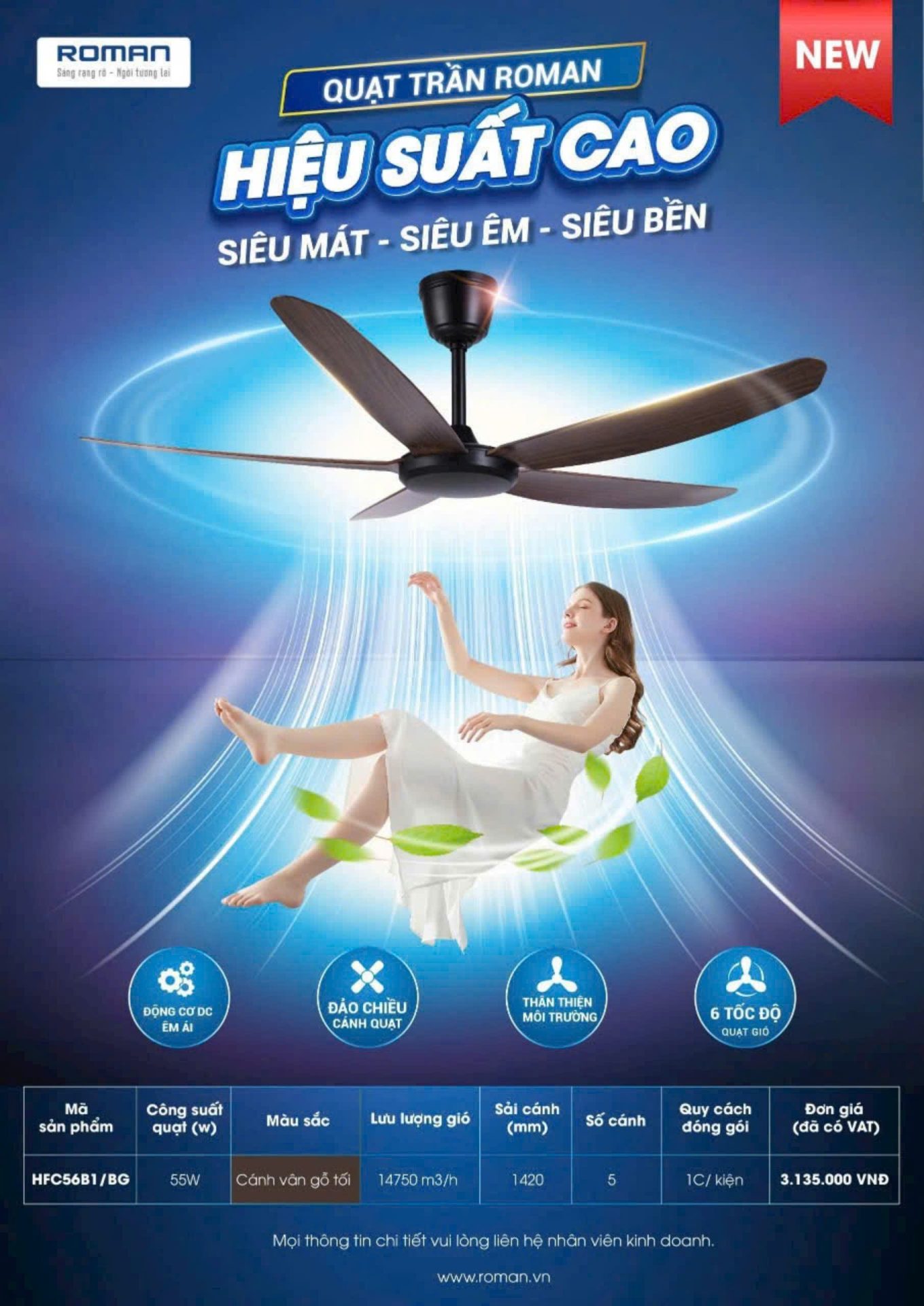 Đặt mua Quạt trần 5 cánh điều khiển Roman HFC56B1